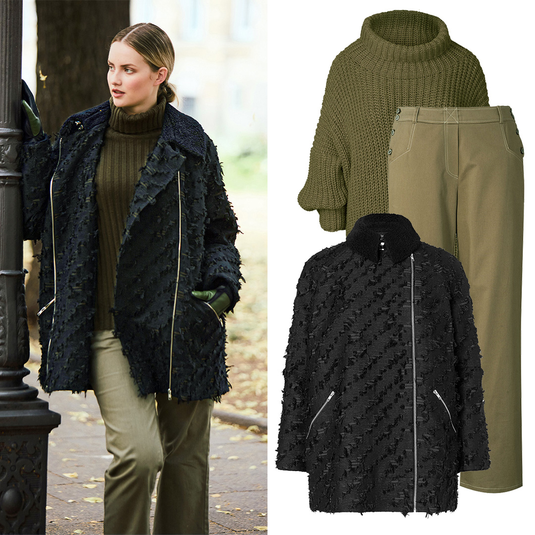 Помітний предмет гардеробу, який дарує затишок: чорна жакардова куртка-пілот приваблює плюшевою тканиною на комірі та манжетах, виразними шкіряними деталями і блискавками, а також сучасним силуетом – ідеальний міський супутник для холодних днів.