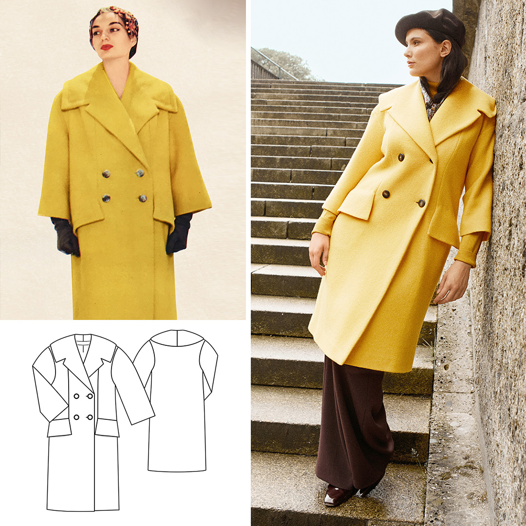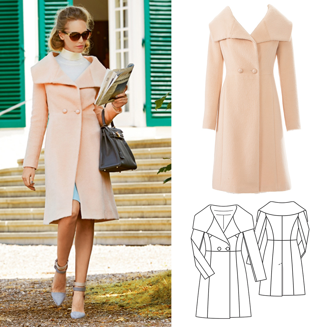 Великий комір цього двобортного пальта лягає на плечі майже як палантин. І тут є ще одна родзинка: комір, суцільнокроєний із лацканами. Ми дещо вкоротили модель – кому подобається, як в оригіналі 1955 року, можете просто видовжити викрійку.