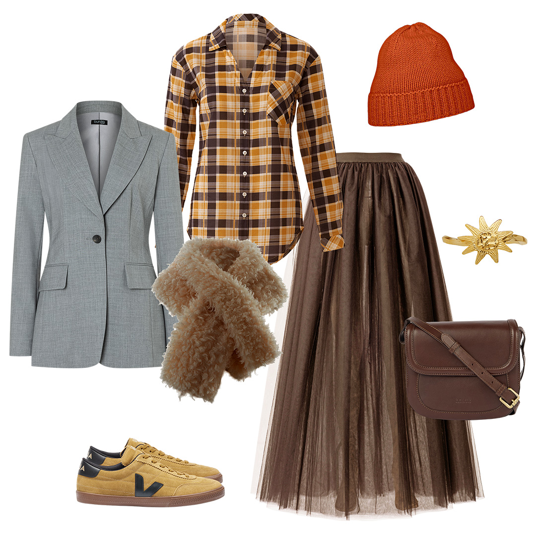 Блейзер Burda 11/2025#119, сорочка Каталог Burda 1/2019#6326 B, спідниця Burda 3/2019#132, шарф Burda 11/2025#119, шапка ALLUDE, снікерси VEJA, сумка O MY BAG, каблучка MAANESTEN