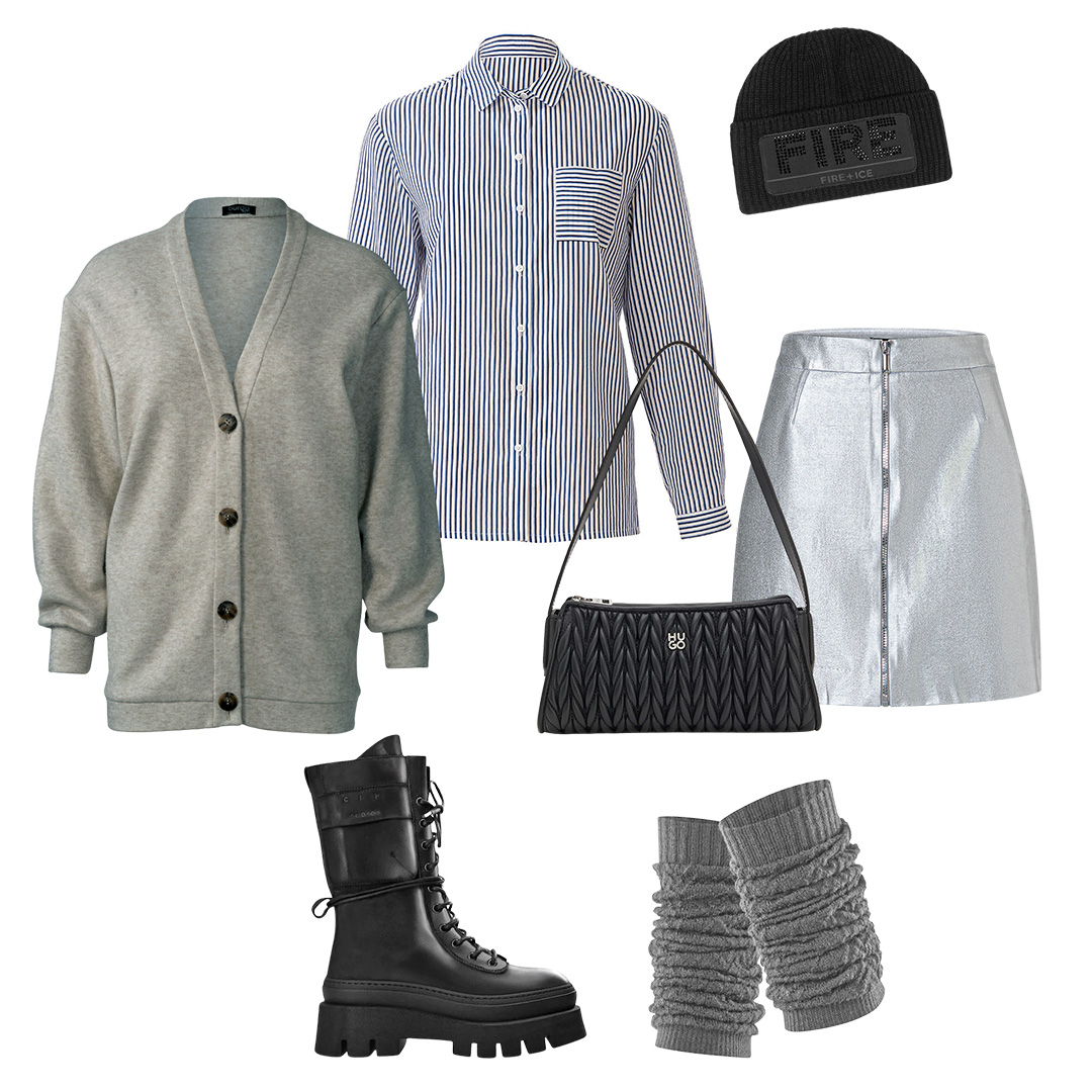 Стильний похідний лук: сорочка у смужку і кардиган вводять у гру завжди трендові візерунки та фактури, а срібна мініспідниця і грубі черевики створюють контраст — невимушений, сучасний і сміливий.