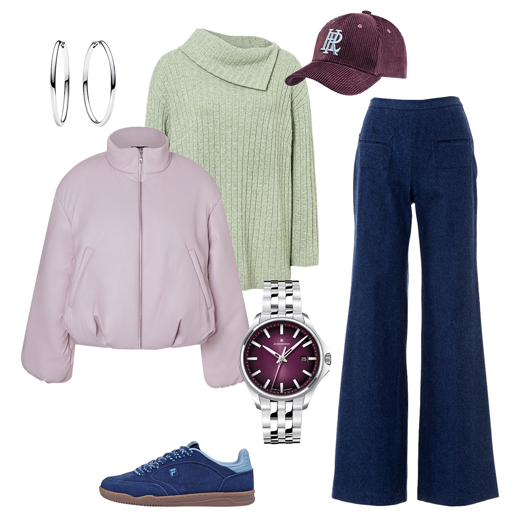 Куртка Burda 1/2026#115, пуловер Burda 12/2025#103, джинси Burda 6/2016#119, бейсболка HERRLICHER, снікерси FILA, годинник JUNGHANS, сережки PANDORA