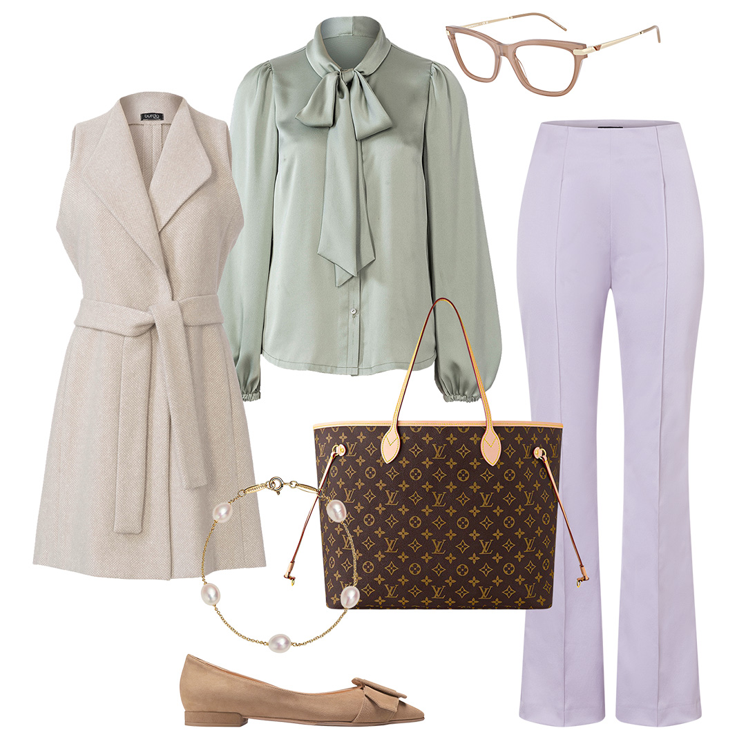 Ніжні тони, стильний вигляд: блуза з коміром-метеликом, довгий жилет і балетки створюють класичний шик. Спортивні брюки додають сучасний штрих, який ідеально доповнює вишукана сумка-шопер — усе в бежевих і пастельних тонах.