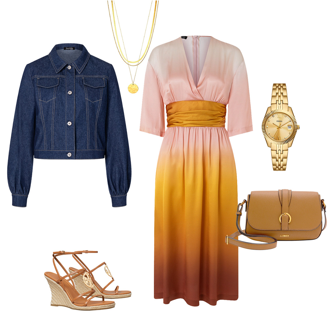 Теплі кольори, які мені до лиця, і повітряний, жіночний крій: ця сукня — мій модний хіт цього літа. У довжині міді вона має дуже шляхетний вигляд – а з високими підборами ця модель пасує також невисоким жінкам, як я. Джинсова куртка є цікавим порушенням стилю.