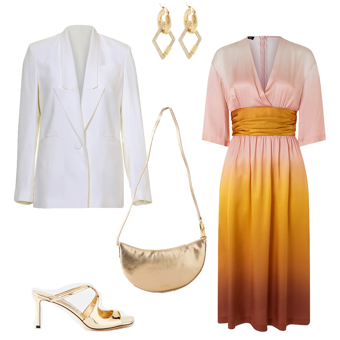 Середньої довжини сукня з ефектом деграде ідеально підходить для коктейльних вечірок або напівформальних заходів. Вона елегантна і вишукана, золотаві аксесуари і взуття додадуть образу святковості. Білий блейзер – універсальний комбіпартнер.