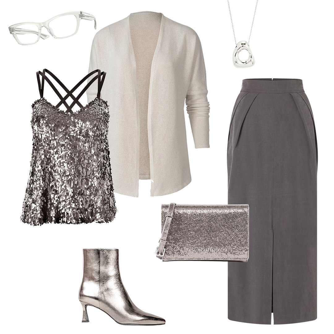 Міський шик з модним акцентом: елегантна спідниця поєднується з легким топом та доповнюється стильним кардиганом. Образ тон у тон надає наряду витонченої, вишуканої легкості.