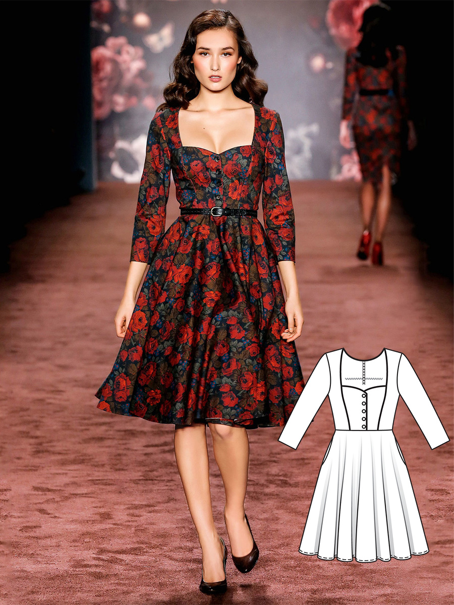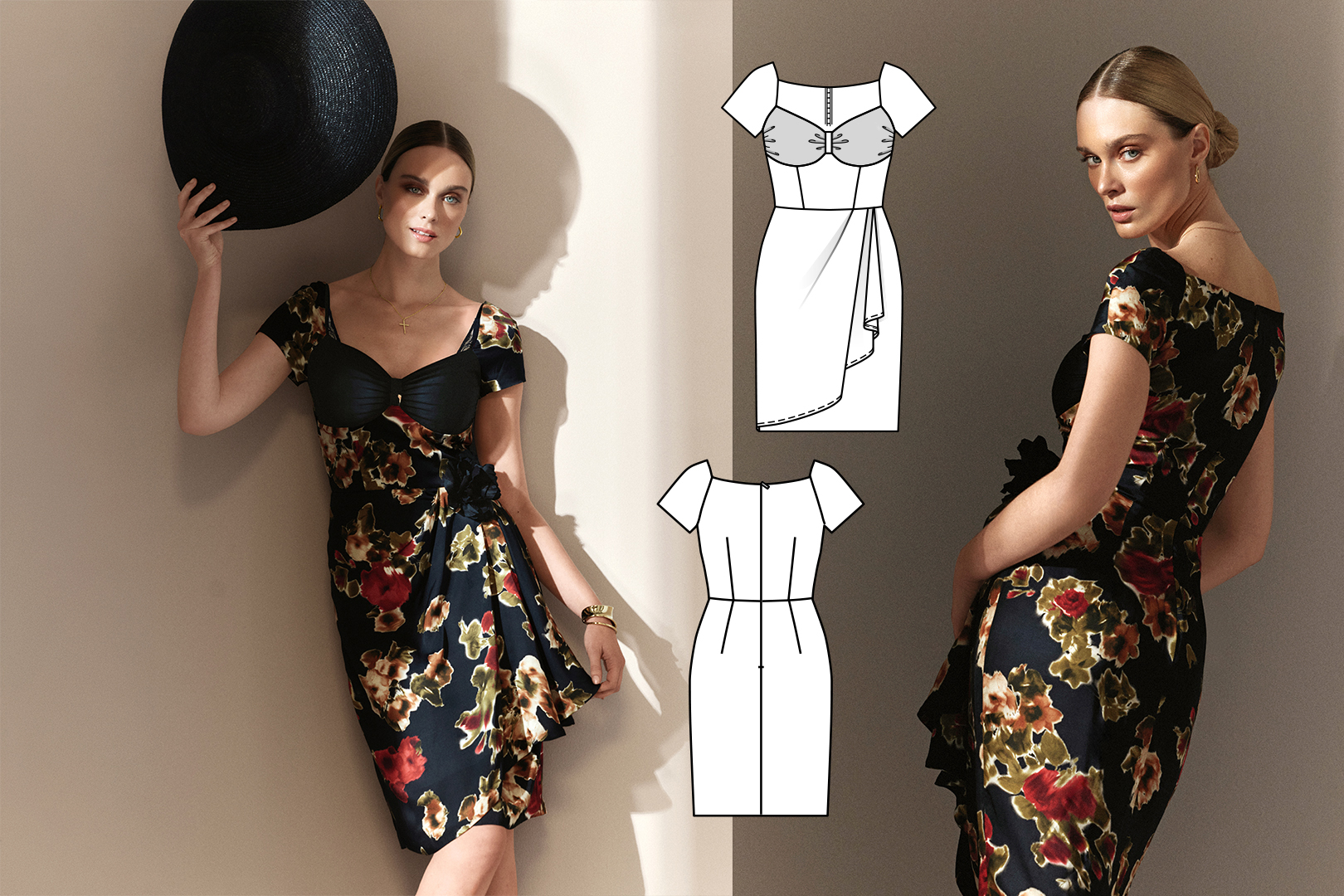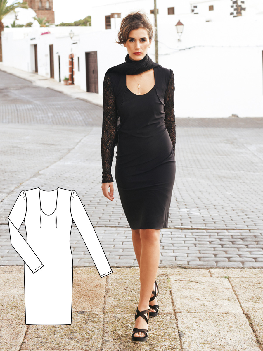 Сукня-футляр із поздовжніми рельєфними швами демонструє усі принади жіночої фігури і сидить бездоганно. Широкий виріз і деталі, що імітують чашечки, моделюють красиве декольте. Для свободи рухів ззаду на спідниці виконаний розріз.