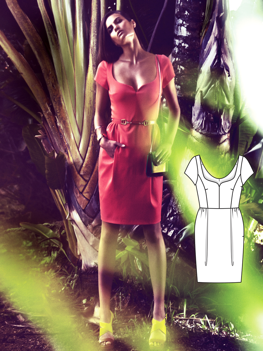 Яскрава, як стигла м'якоть папаї... Сукня-футляр з короткими рукавами привертає увагу не тільки дивовижним кольором, а й широким декольте у формі серця. Спідниця-тюльпан створює сприятливі пропорції, роблячи талію візуально вужчою, а стегна пишнішими.