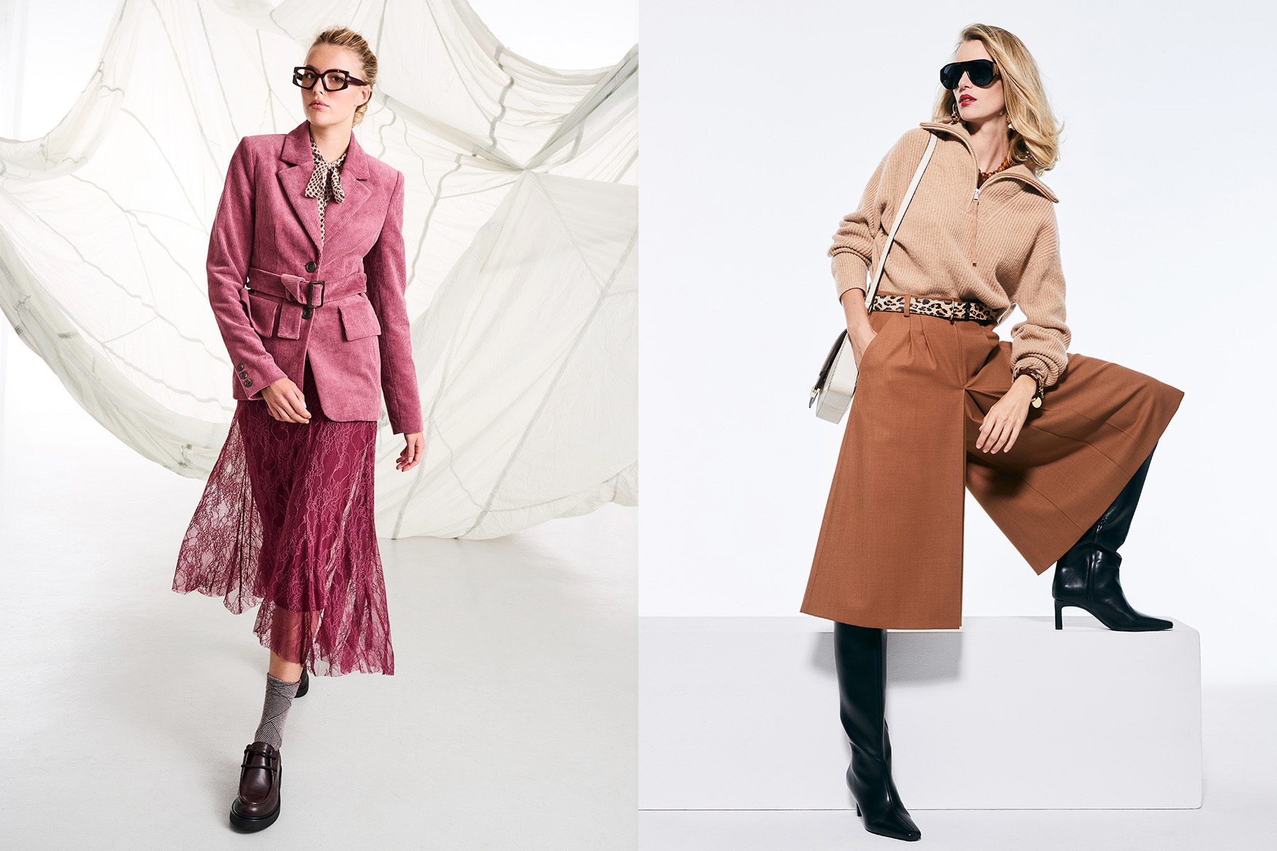 Головний акцент сезону — зона шиї. Великі коміри, об’ємні шарфи, декоративні банти або вузькі стрічки, що замінюють краватку, привертають увагу та завершують образ. Серед взуття лідирують класичні моделі: лофери, черевики на низькому підборі чи чоботи зі стійким каблуком. Усе, що зручно носити щодня, але водночас має елегантний вигляд. Не забуваємо про ремені — вони підкреслюють талію поверх жакетів, пальт і суконь, формуючи пропорційний, жіночний силует.