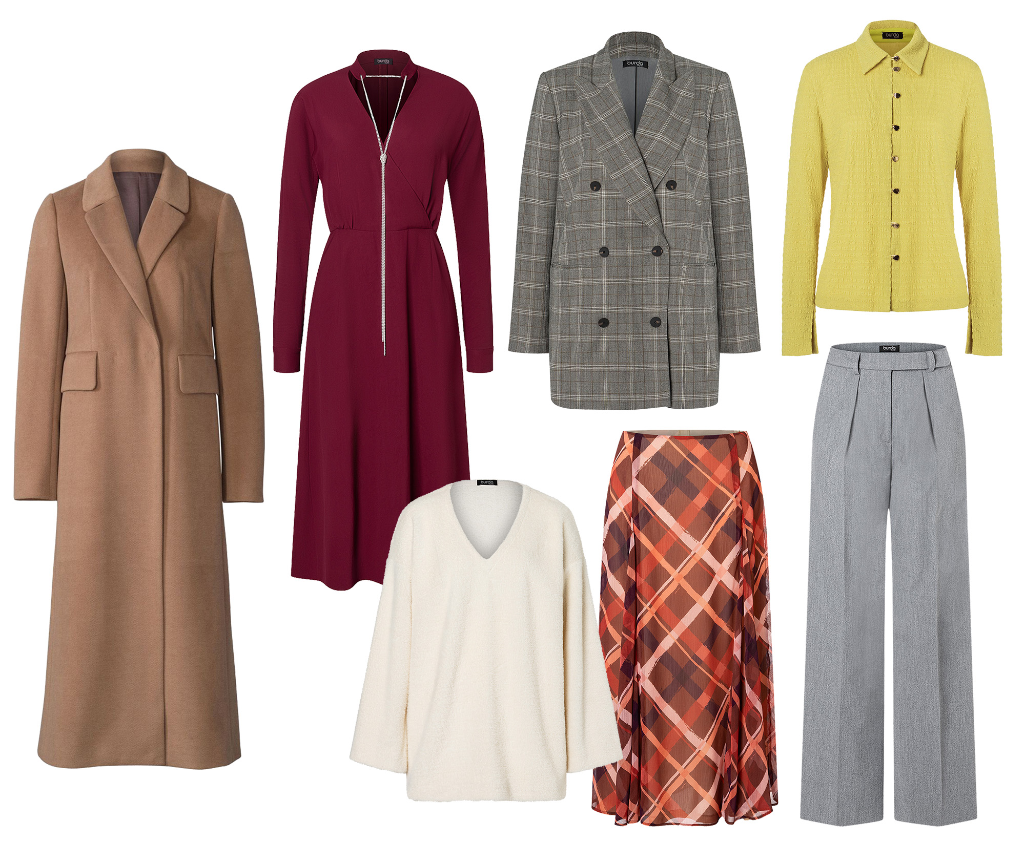 Пальто Burda 8/2022#106, сукня Burda 4/2024#108, пуловер Burda 8/2025#102, блейзер Burda 11/2024#103, спідниця Burda 9/2025#107, сорочка Burda 2/2025#112, штани Burda 9/2025#115