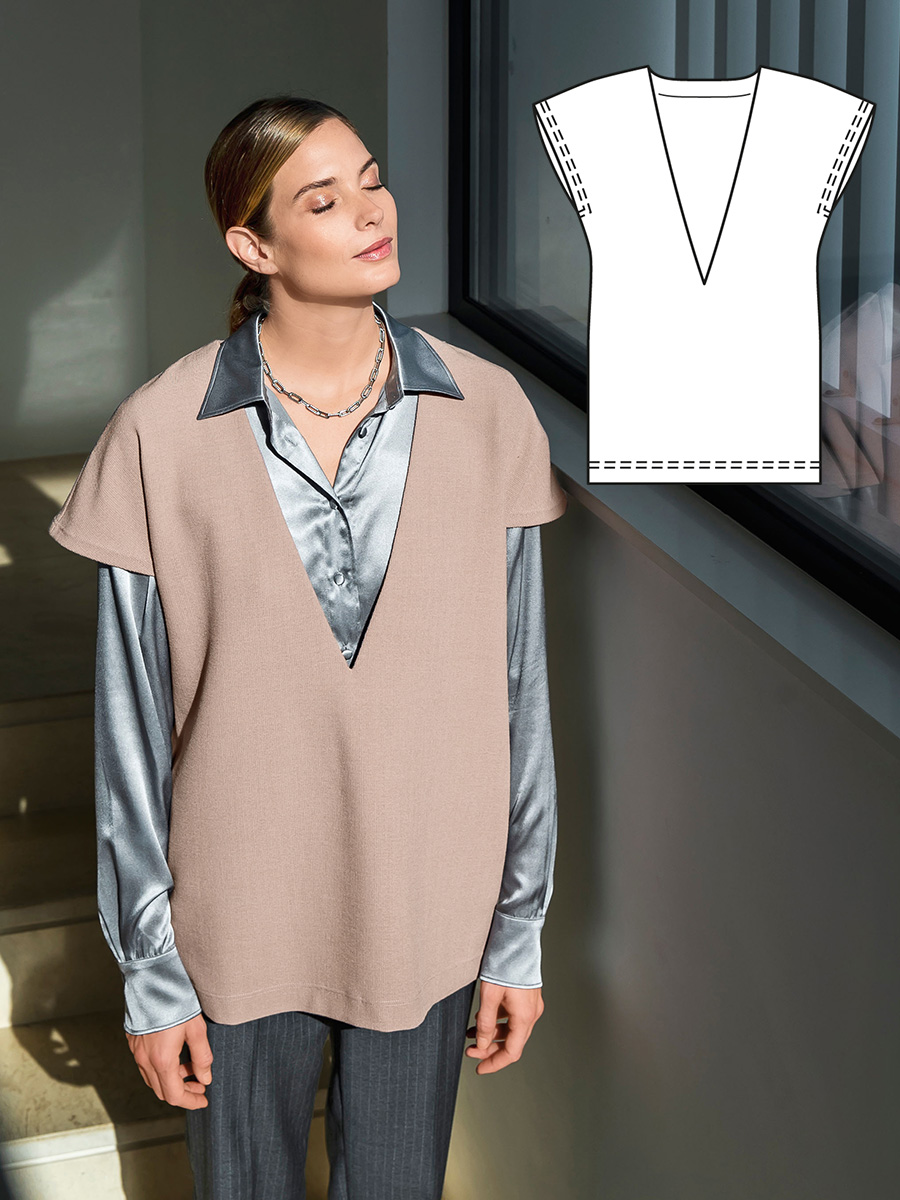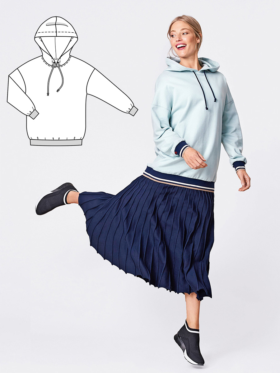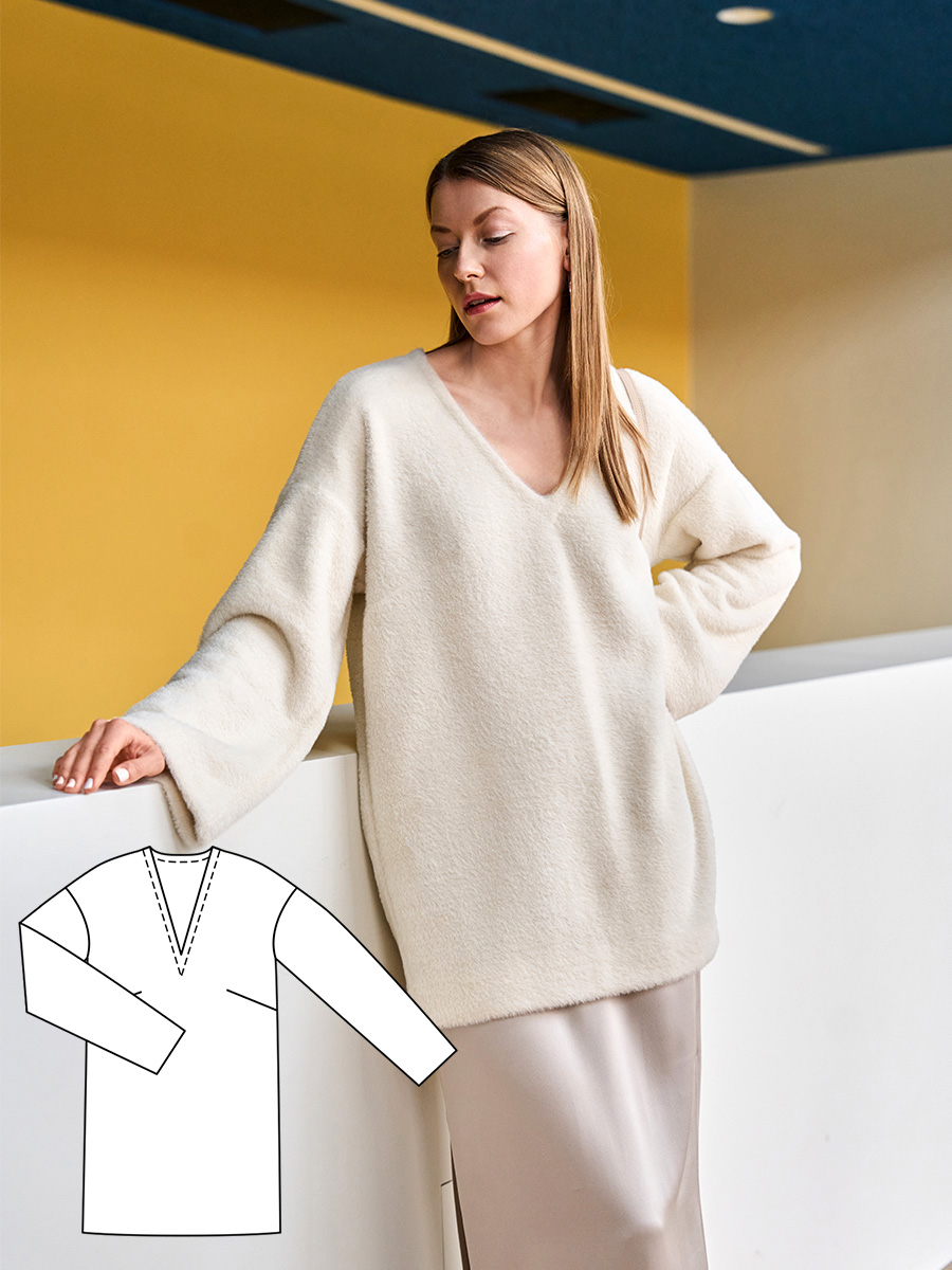 У такій довжині, як на фото, укороченій чи навіть видовженій до сукні: ця модель пуловера дуже різнопланова, як і ви, та гарантовано матиме чудовий вигляд і з принтом. Ідея: обробити виріз горловини різнокольоровими нитками на оверлоці.