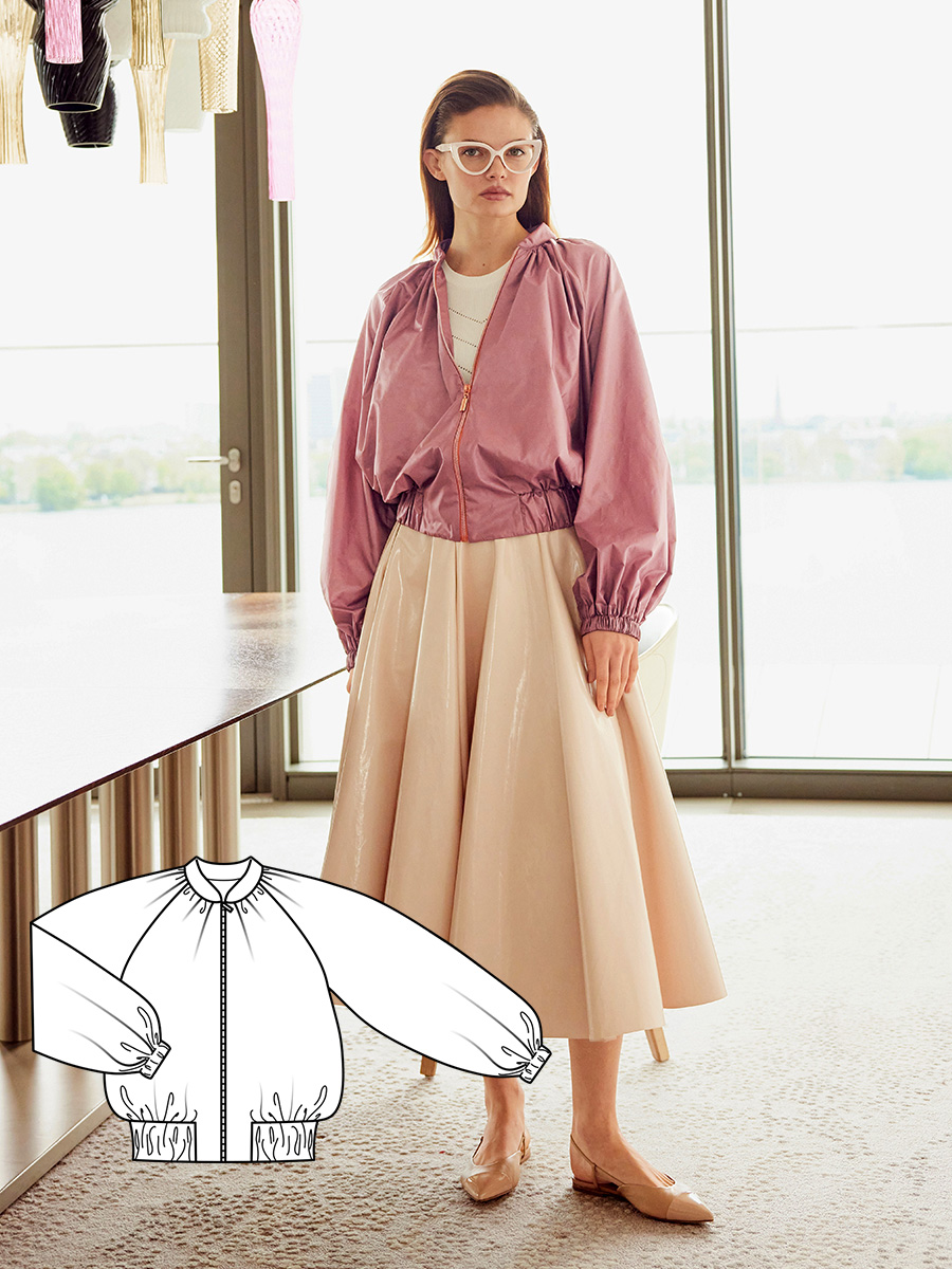 Комір-стойка, манжети і, звичайно ж, еластичний пояс по низу: на відміну від інших блузонів ці деталі виконані не з в’язаного полотна в резинку, а з основної тканини. Зборки по низу рукавів і блузона доповнюються зборкою горловини і створюють об’єм, рукави реглан додають спортивної та водночас елегантної нотки.