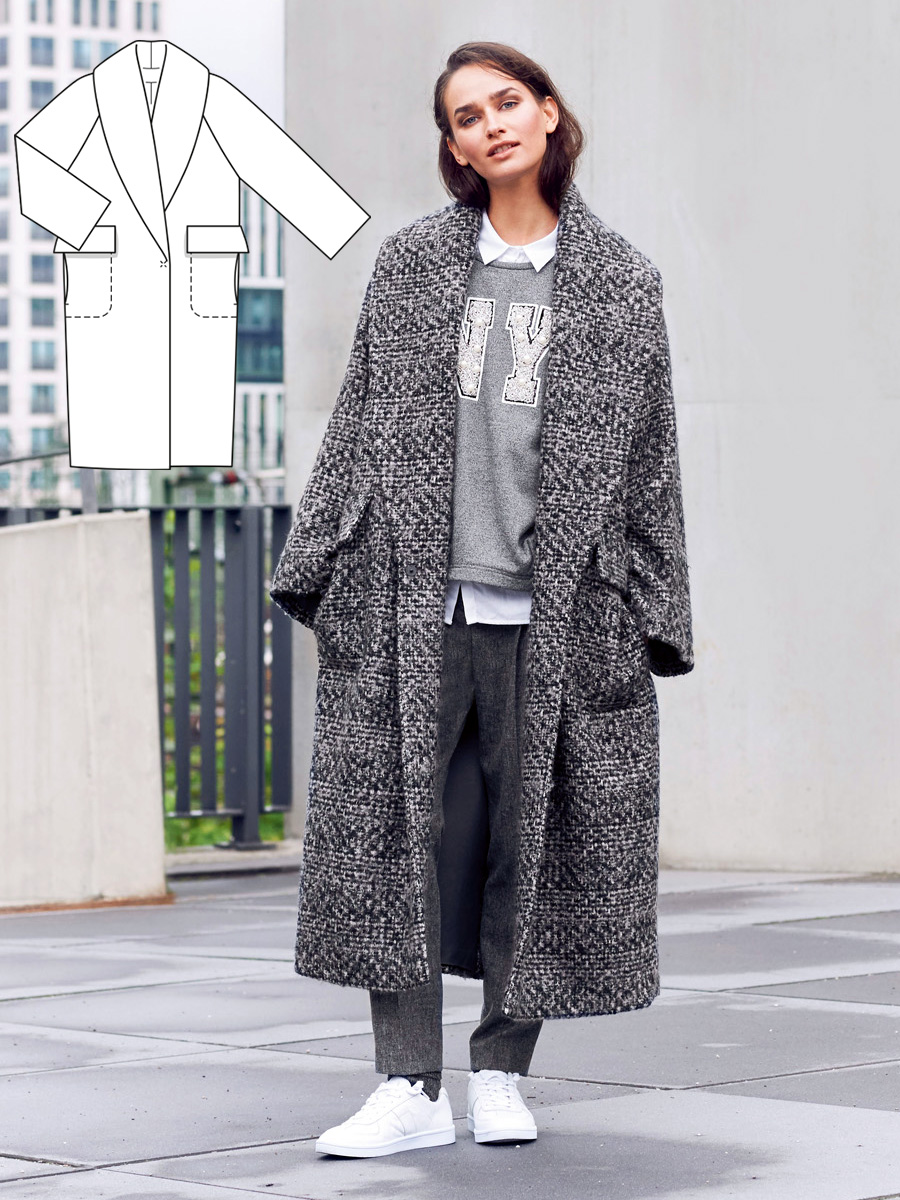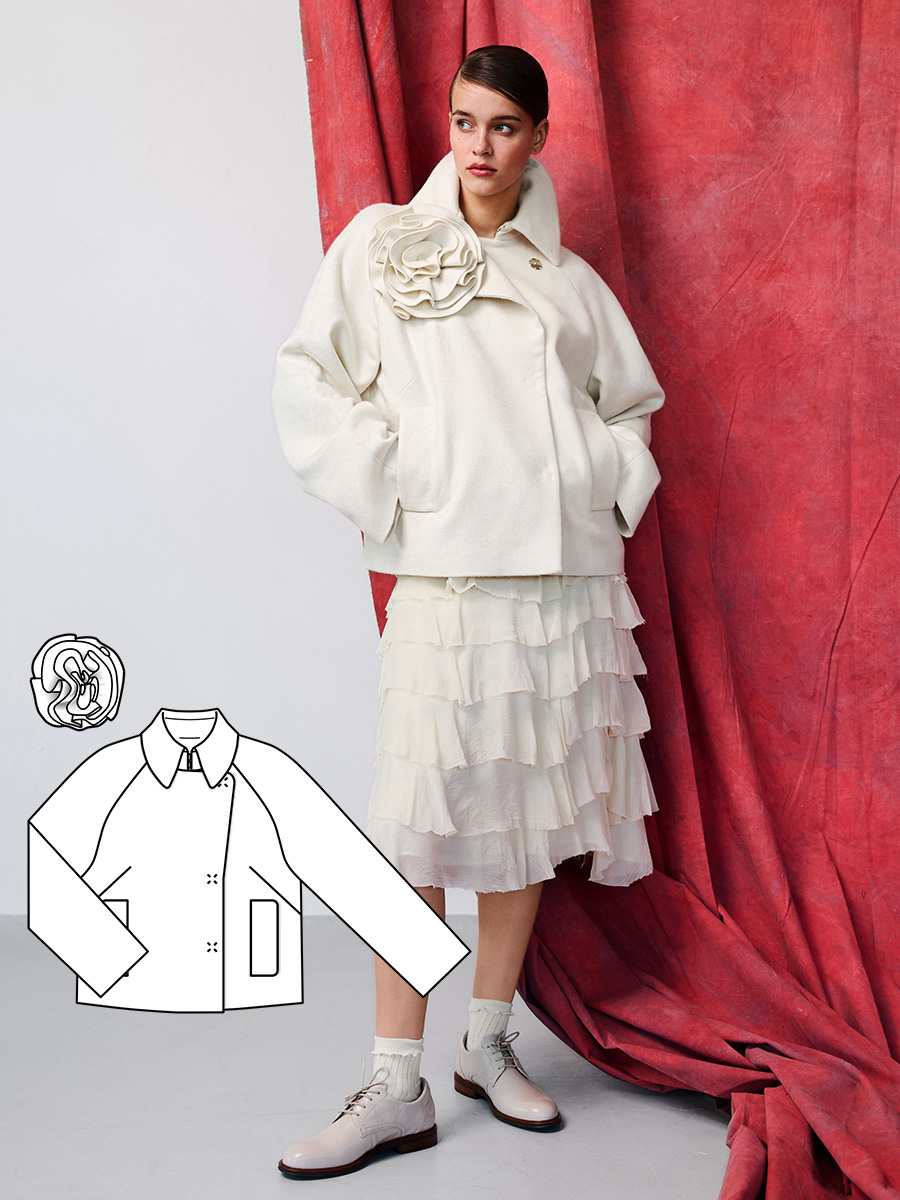 Просторе пальто з широким шалевим коміром і такими ж рукавами реглан можна носити зверху будь-якого одягу, і при цьому воно не буде ускладнювати рухів. Креативно: деталі пояса спинки так пришиті до пілочок, що створюють ілюзію клапанів. Ззаду деталі пояса з'єднуються ґудзиком.
