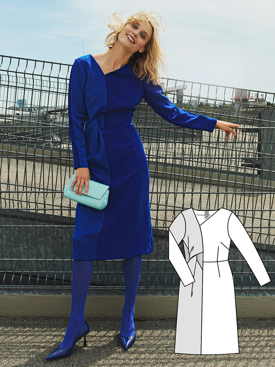 Асиметричний виріз, задрапірований вузол і контраст між матовим та блискучим боками тканини роблять сукню дуже виразною. Колготи в тон вдало доповнюють образ у суцільному королівському синьому кольорі.