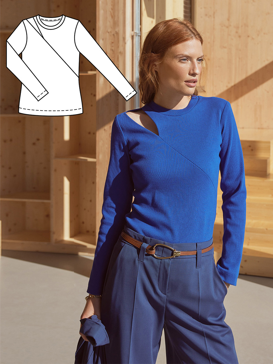 Крій пуловера досить простий і саме завдяки цьому відразу впадає в око оригінальна деталь – асиметричний проріз на плечі. До речі, зі вкороченими рукавами вийде стильна футболка.