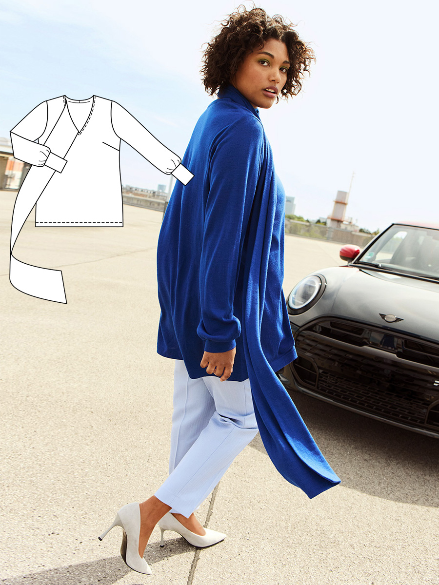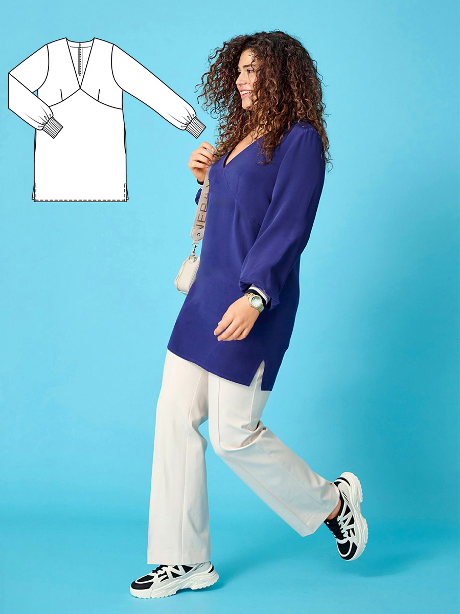 Романтичний крій у стилі ампір, глибокий V-подібний виріз, благородний відтінок «королівський синій» та трикотажні манжети в резинку – ця туніка поєднала жіночні та спортивні елементи.