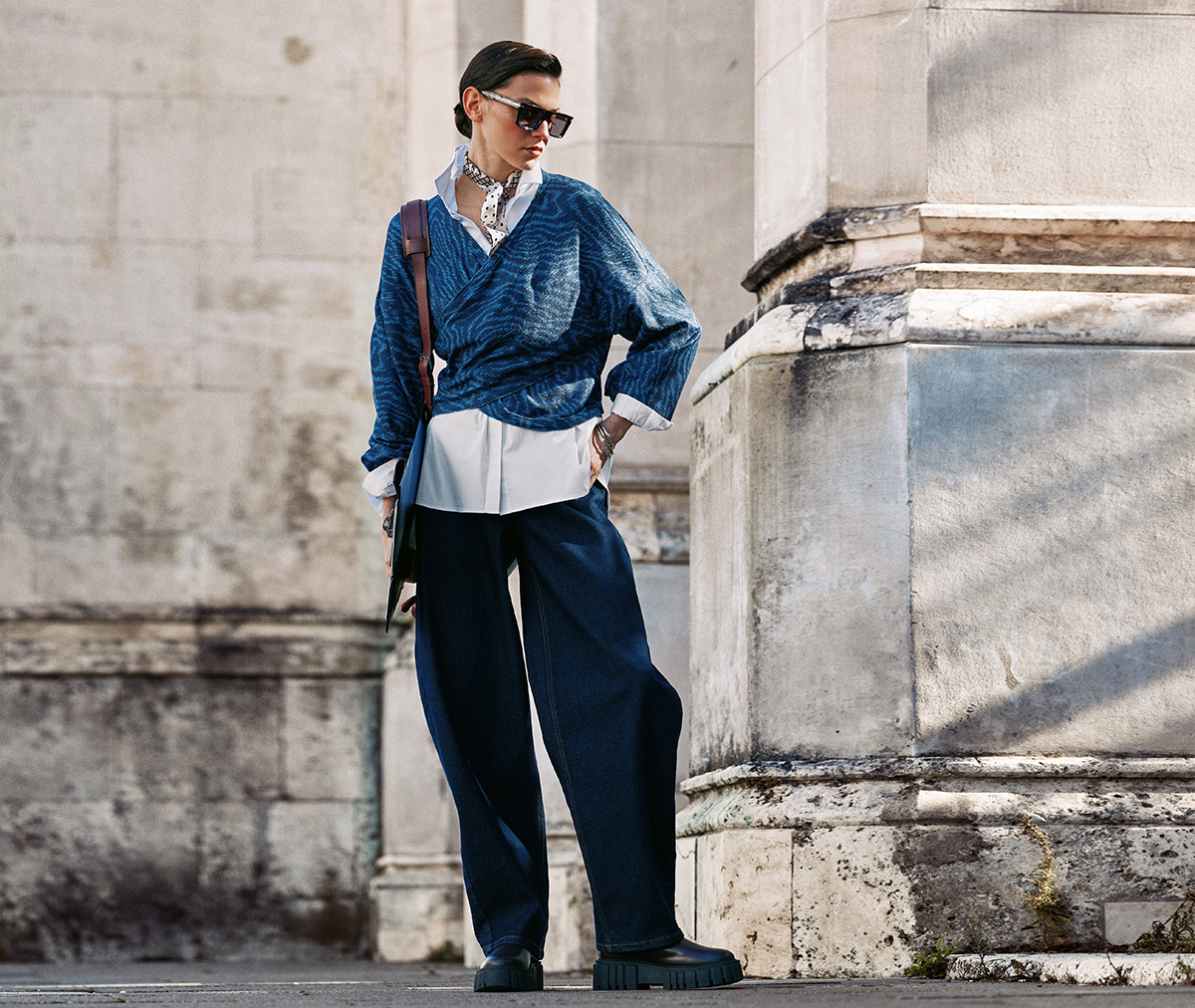 Синій колір електрик як яскравий промінь світла: невимушений пуловер із V-подібною горловиною і пришитим шарфом демонструє розслаблений силует. У поєднанні зі світло-синіми штанами і білими туфлями на підборах створюється захопливий образ.