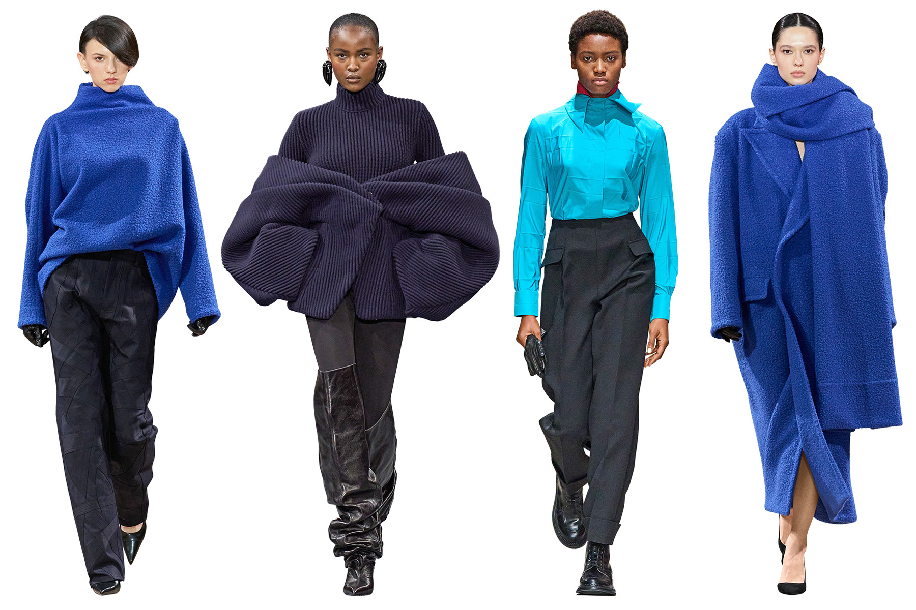 У тренді насичені та глибокі тони: кобальтовий, ультрамариновий, королівський синій, а також спокійніші відтінки індиго й сіро-блакитний. Такі кольори мають гарний вигляд як у монохромних комплектах, так і в комбінаціях з білим, сірим, бежевим або чорним.