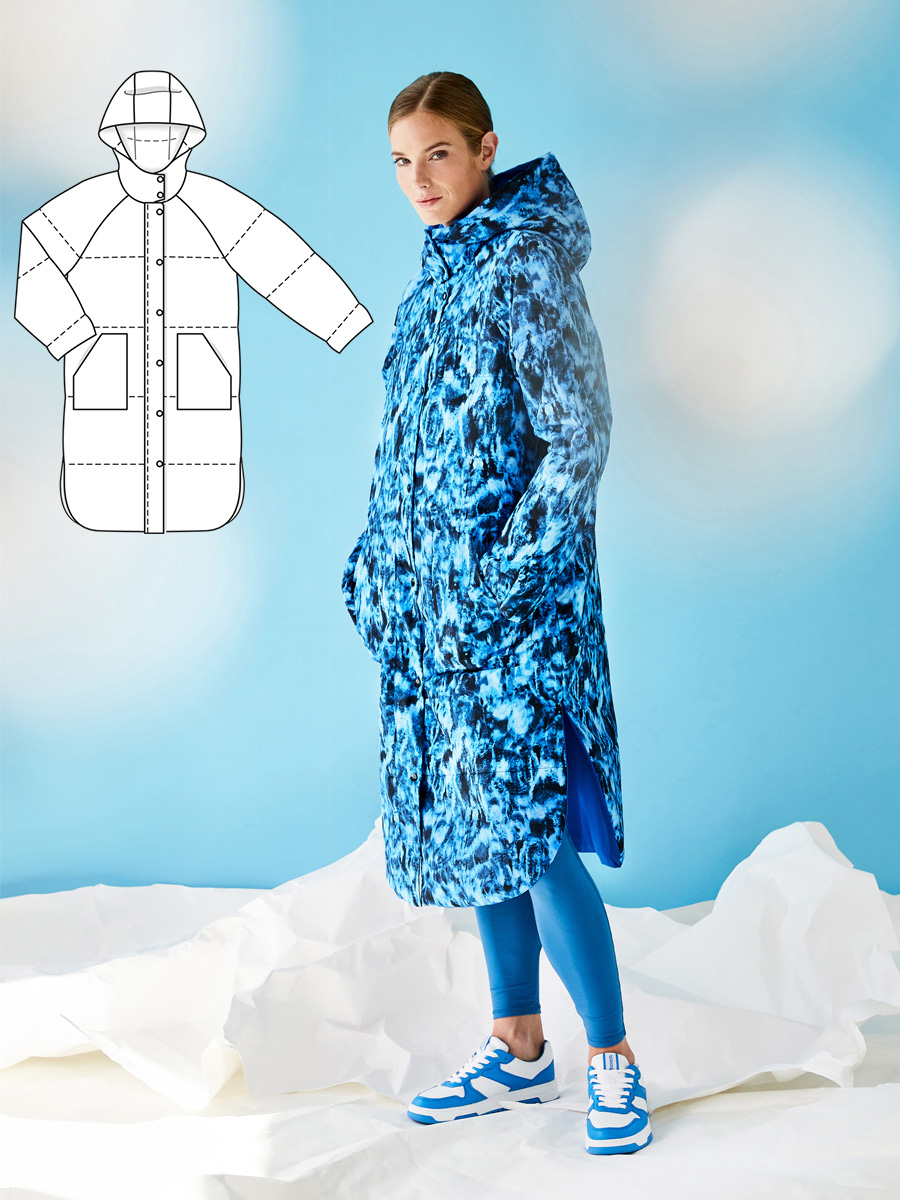 Стильне пальто для прогулянок у будь-яку погоду можна пошити самотужки: ця модель із вітронепродувного нейлону утеплена волюменфлізом, має великий капюшон, високий комір-стойку і глибокі кишені.