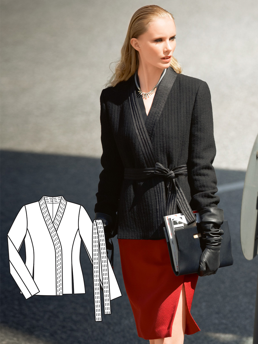 Вистрочені планки бортів, горловини і такий же пояс, що зав'язується, роблять цей жакет із запахом схожим на костюм для бойових мистецтв. Виконаний повністю в чорному кольорі, він неймовірно елегантний! Такому «кавалеру» як наш жакет потрібна гідна пара: спідниця-олівець з ефектом запаху і довгою фігурною шліцею спереду.