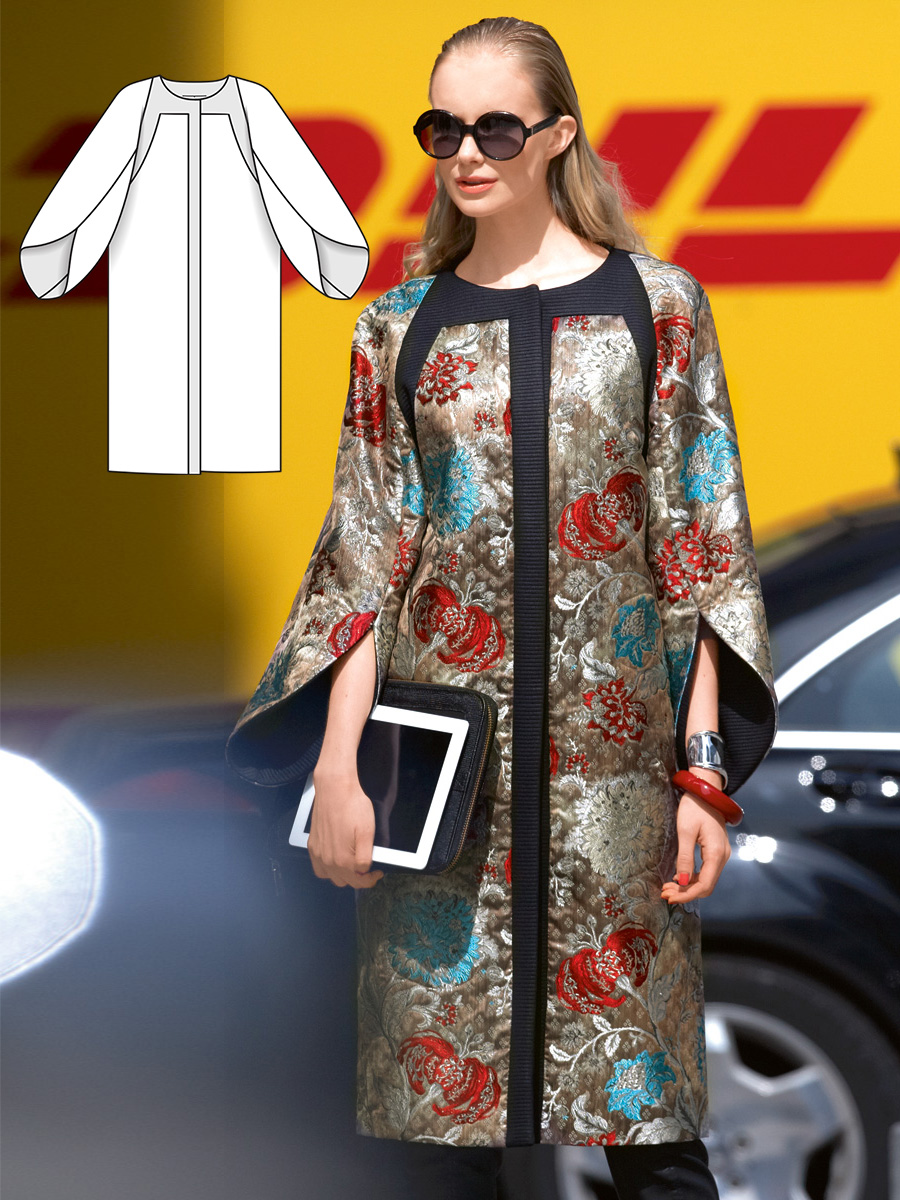 Візерунчасте пальто, оздоблене чорними планками вздовж горловини, пройм і бортів, ніби списане зі старовинної японської гравюри! Особливий інтерес представляють широкі рукави реглан, що нагадують листя екзотичної рослини. Щоб деталі тримали форму, при пошитті використовується тонка прокладка волюменфліз.