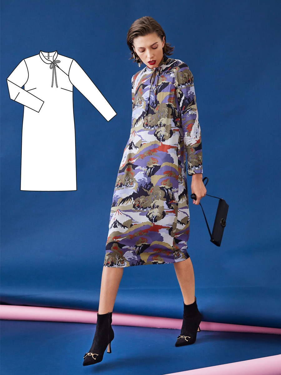 Елегантно та не нудно: для сукні з вузьким ліфом, спідницею А-силуету і стоячим коміром, що переходить у шарф, ми вибрали тканину в орієнтальному стилі з японськими журавлями. Талію можна додатково підкреслити вузьким ременем.