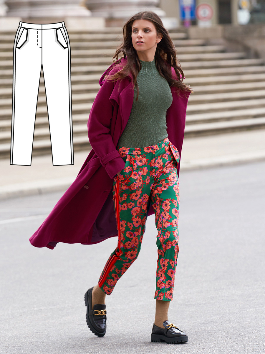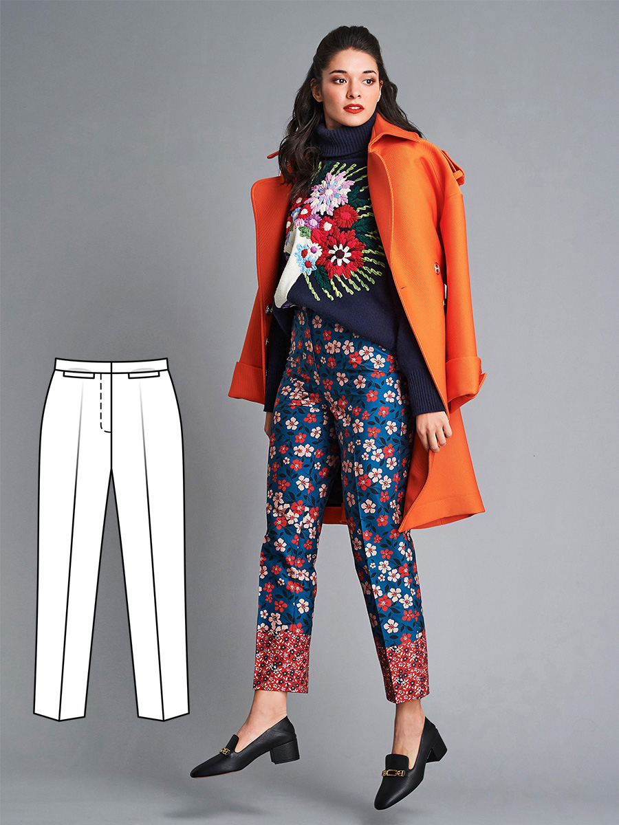 Класична модель у новому звучанні: грайливу нотку вносить тканина із яскравим квітковим узором і контрастним бордюром. В цілому ж це строгі брюки зі стрілками та поясом.