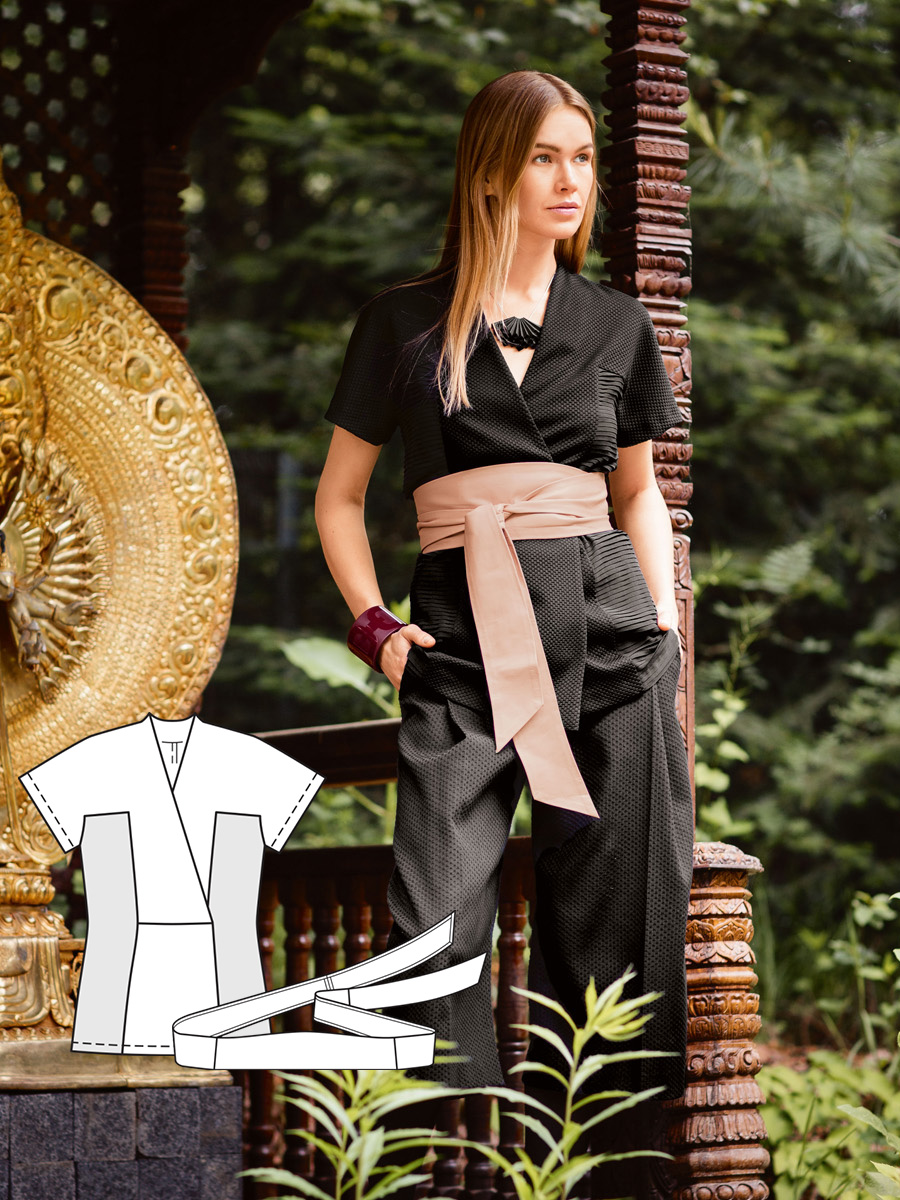 Короткий жакет покрою кімоно з широкими рукавами, невеликим запахом і застібкою із позумента допоможе справити гідне враження на оточуючих. Особливого шарму цій моделі надають бейка горловини і планки рукавів, виконані з тканини з квітками сакури.