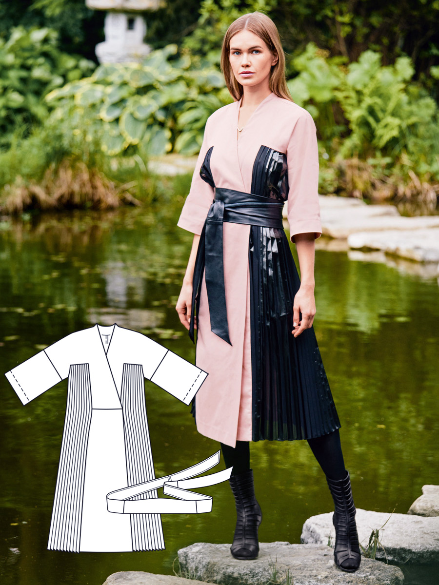 У сукні, що нагадує традиційне японське вбрання, - з широкими рукавами, блискучими боковими вставками і шкіряним поясом - ви справите справжній фурор! Запах на пілочках додатково фіксується на талії двома прихованими кнопками.