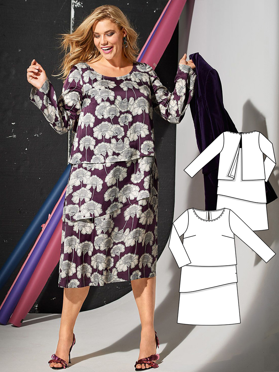 Великий візерунок для дам із пишними формами? Так, це працює! Візьмемо, приміром, нашу сукню з рукавами 3/4: вона облягає фігуру завдяки рельєфним швам і має однотонні вставки з боків для створення стрункого силуету. Взуття радимо вибирати на високих підборах - тоді ноги будуть здаватися довшими.
