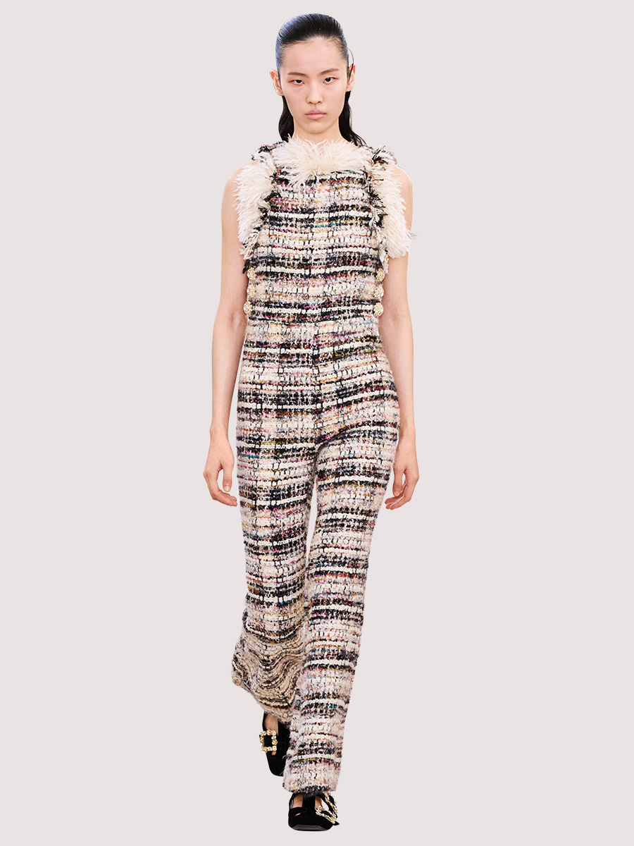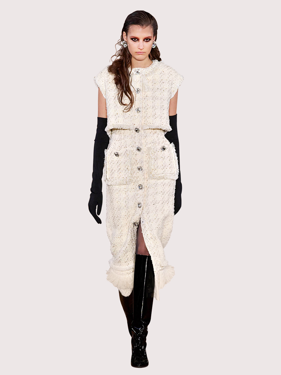 Твід у супермодному стилі а-ля Clueless: виріз та асиметричний зріз сукні прикрашені ледь помітною облямівкою, на спідниці виблискують ґудзики. Для повсякденного носіння ця модель підходить із водолазкою і черевиками.