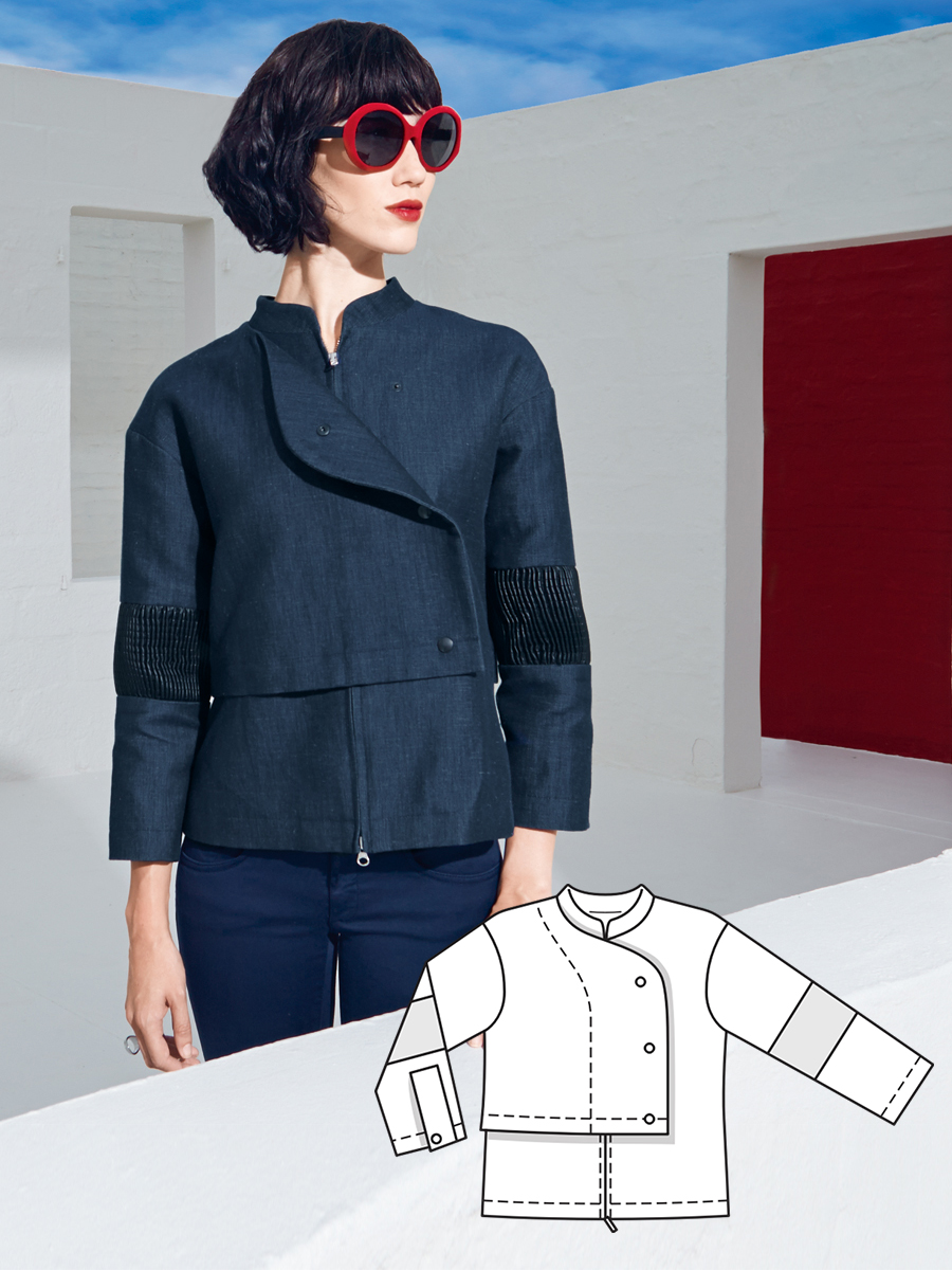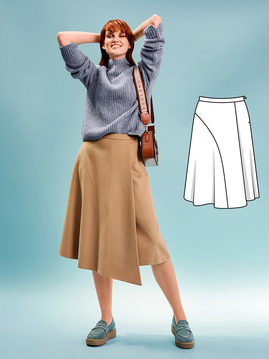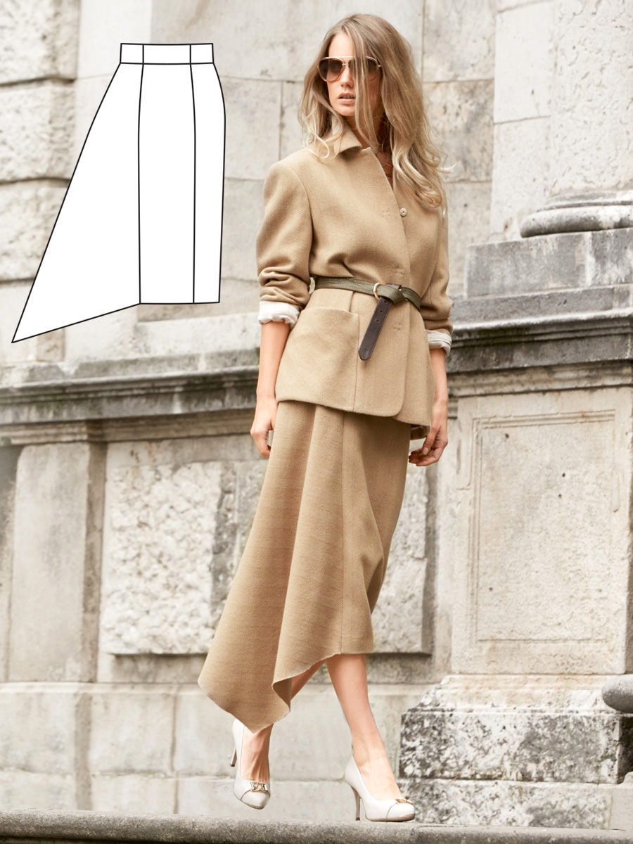 Шукаєте альтернативу нудному діловому костюму? Перед вами більш вільний, майже невимушений варіант: асиметрична спідниця-олівець завдовжки до колін, з пишною прямокутною вставкою збоку плюс жакет із накладними кишенями XXL, який застібається на потайні кнопки.