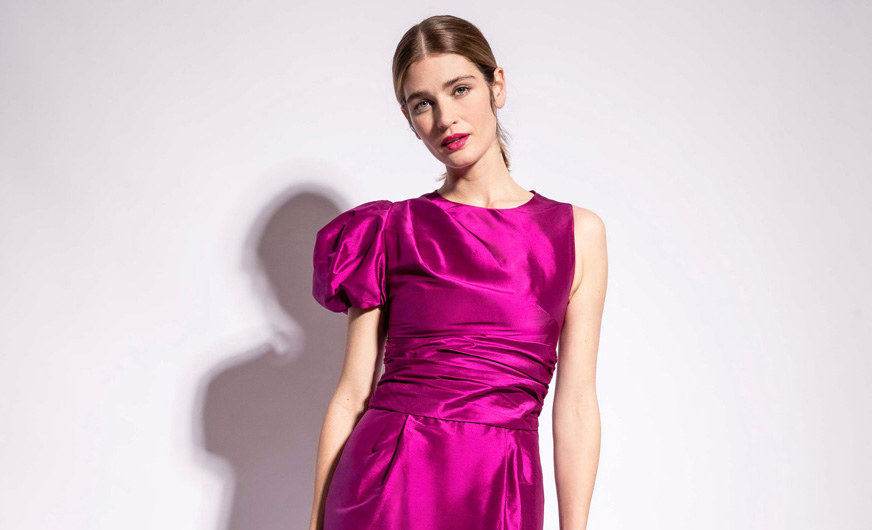 Все геніальне просте. Вузька сукня в стилі Високої моди підкорює коміром-стойкою, суцільнокроєним із рукавом, та асиметричним боковим розрізом збоку.