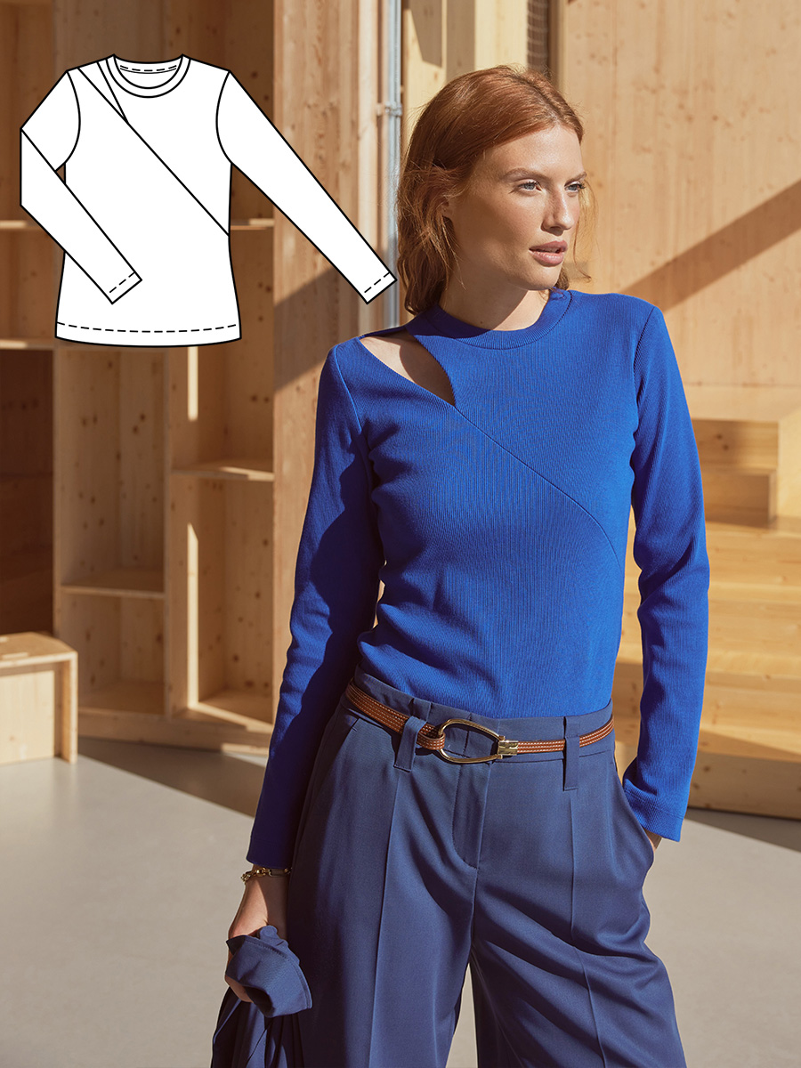 Крій пуловера досить простий і саме завдяки цьому відразу впадає в око оригінальна деталь – асиметричний проріз на плечі. До речі, зі вкороченими рукавами вийде стильна футболка.