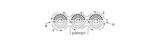 В'язати червоною ниткою або ниткою кольору фуксії. Число початкових петель кратне 9, в'язати згідно зі схемою. Почати з петель від стрілки A, рапорт постійно повторювати, потім, слідуючи за стрілками, обв'язати обидві сторони початкового ряду.