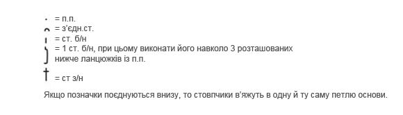 Бірюзовою або світло-зеленою ниткою виконати ланцюжок із 3 п.п. і далі в'язати згідно зі схемою. Виконати 1 раз 1-4-й ряди, потім 3-й + 4-й ряди постійно повторювати.