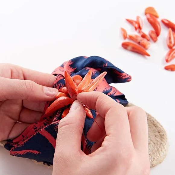 Верхні деталі шльопанців пришити по обидва боки кожної підошви фестончастими стібками з рівномірними інтервалами. На початку і в кінці кожного шва нитку добре закріпити.