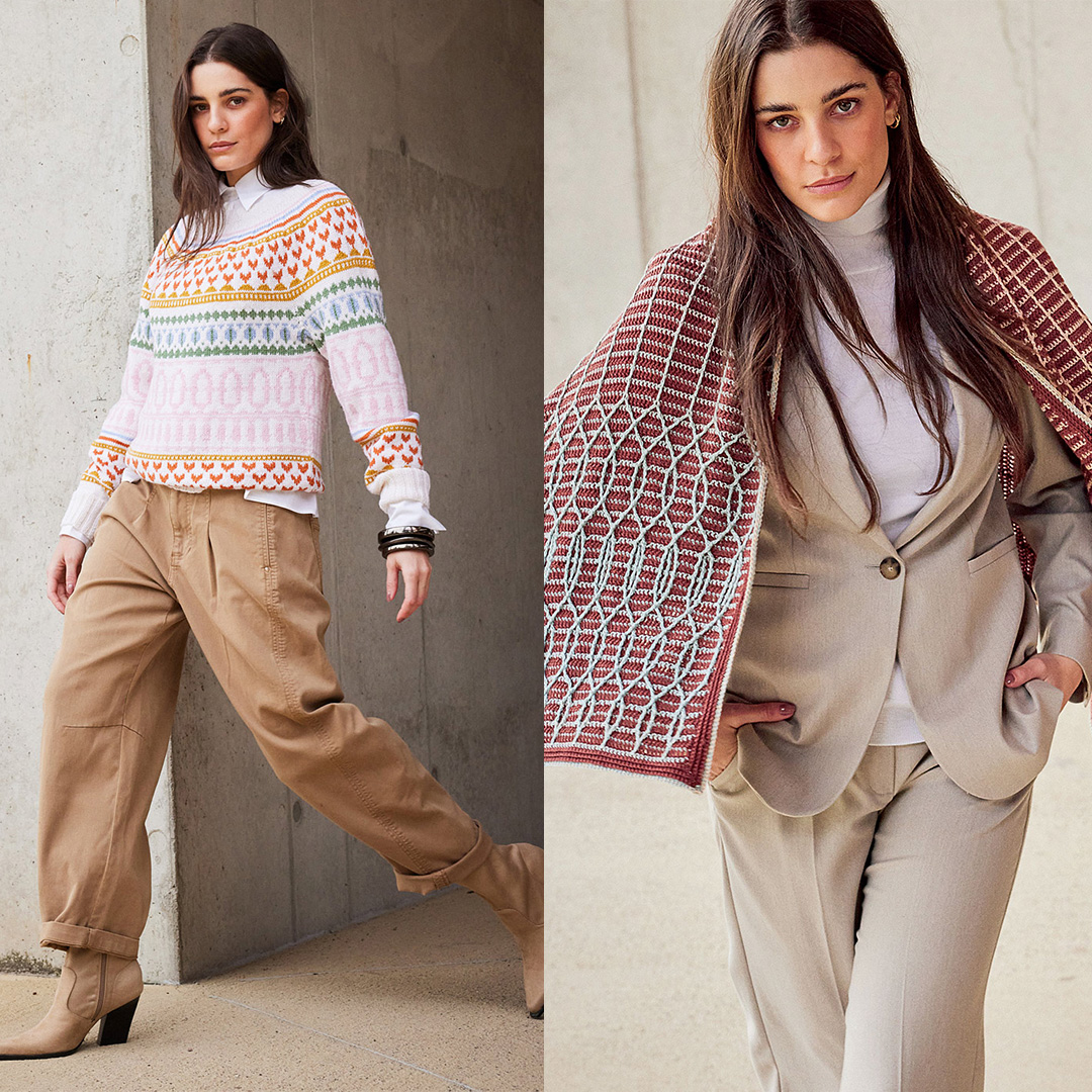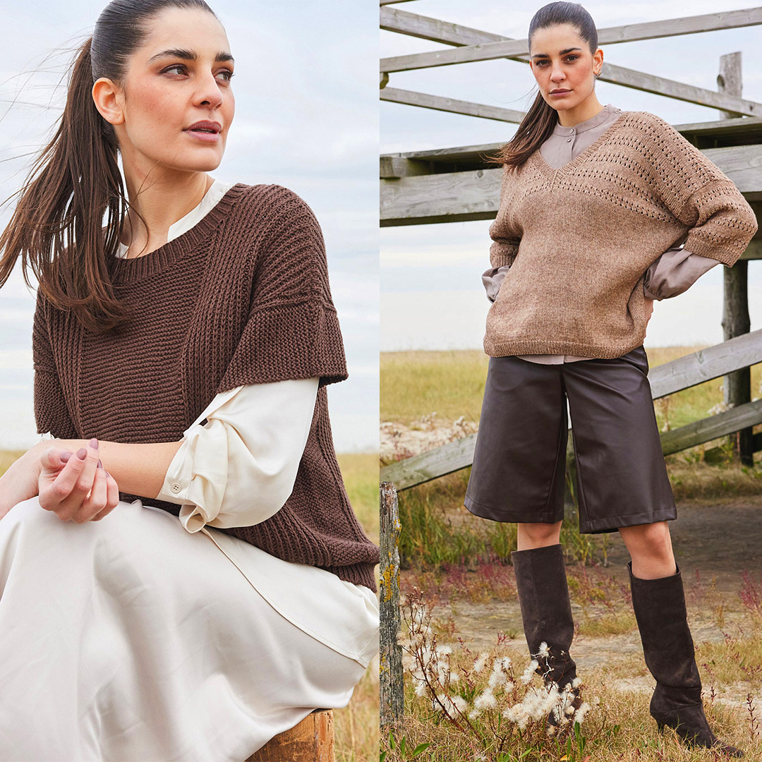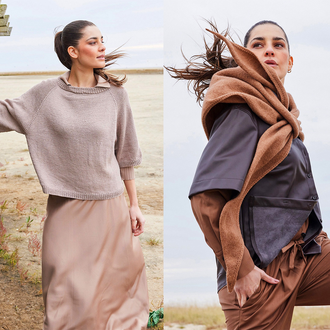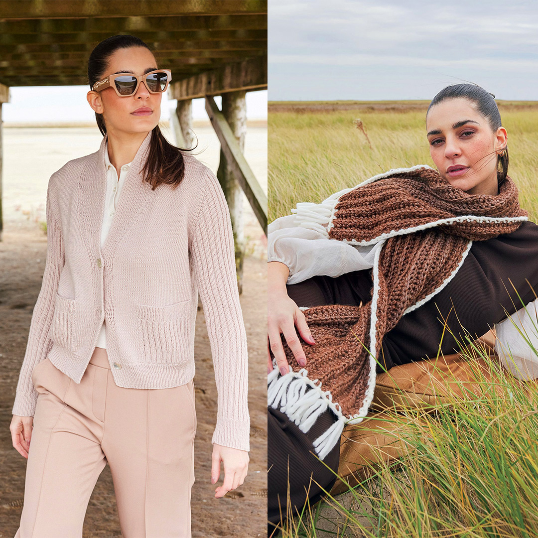 Прості моделі, витончені деталі та пряжа у привабливих трендових кольорах: відтінку рожевого дерева, лососевому, бежевому, шоколадному, карамельному та кавовому.