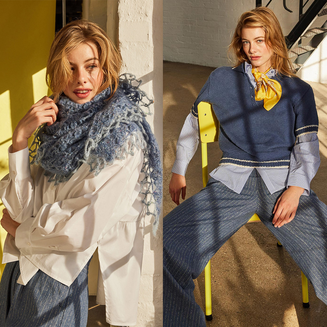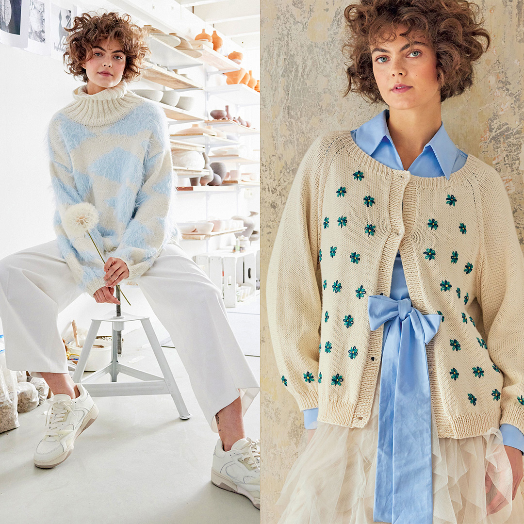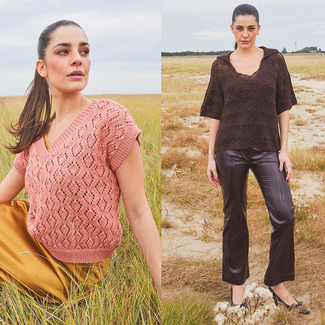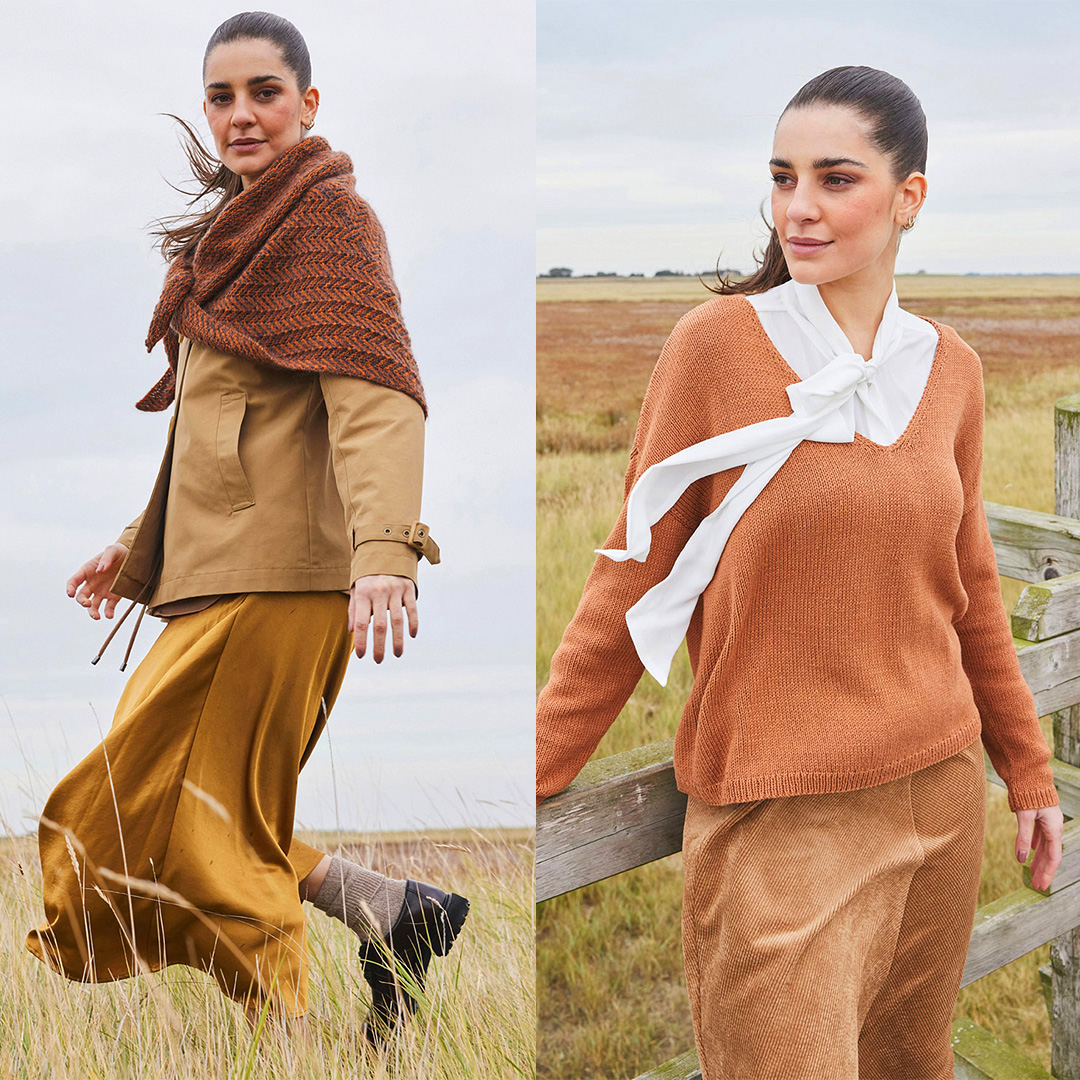 Прості моделі, витончені деталі та пряжа у привабливих трендових кольорах: відтінку рожевого дерева, лососевому, бежевому, шоколадному, карамельному та кавовому.