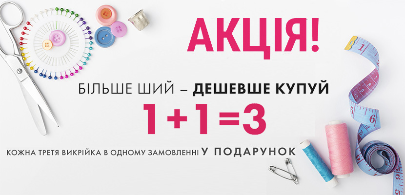 Дорогі майстри та майстрині! Ваша улюблена акція «1+1=3» повертається! 10-31 жовтня кожна третя викрійка в замовленні – у подарунок. Вдалих вам покупок і стильних осінніх обновок!